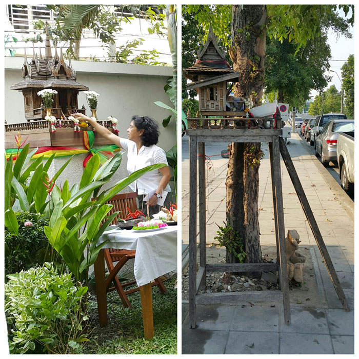 Observe these two spirit houses. They look very similar but are not the same thing at all. Do you know the difference? The spirit house on the left is called “San Pra Poom” and although its looks may vary, it is almost always distinguished by placement on a single pillar. It is usually placed fairly high (the exact height is within a range deemed acceptable by the officiating Brahmin priest), and it is an abode for guardian angels.